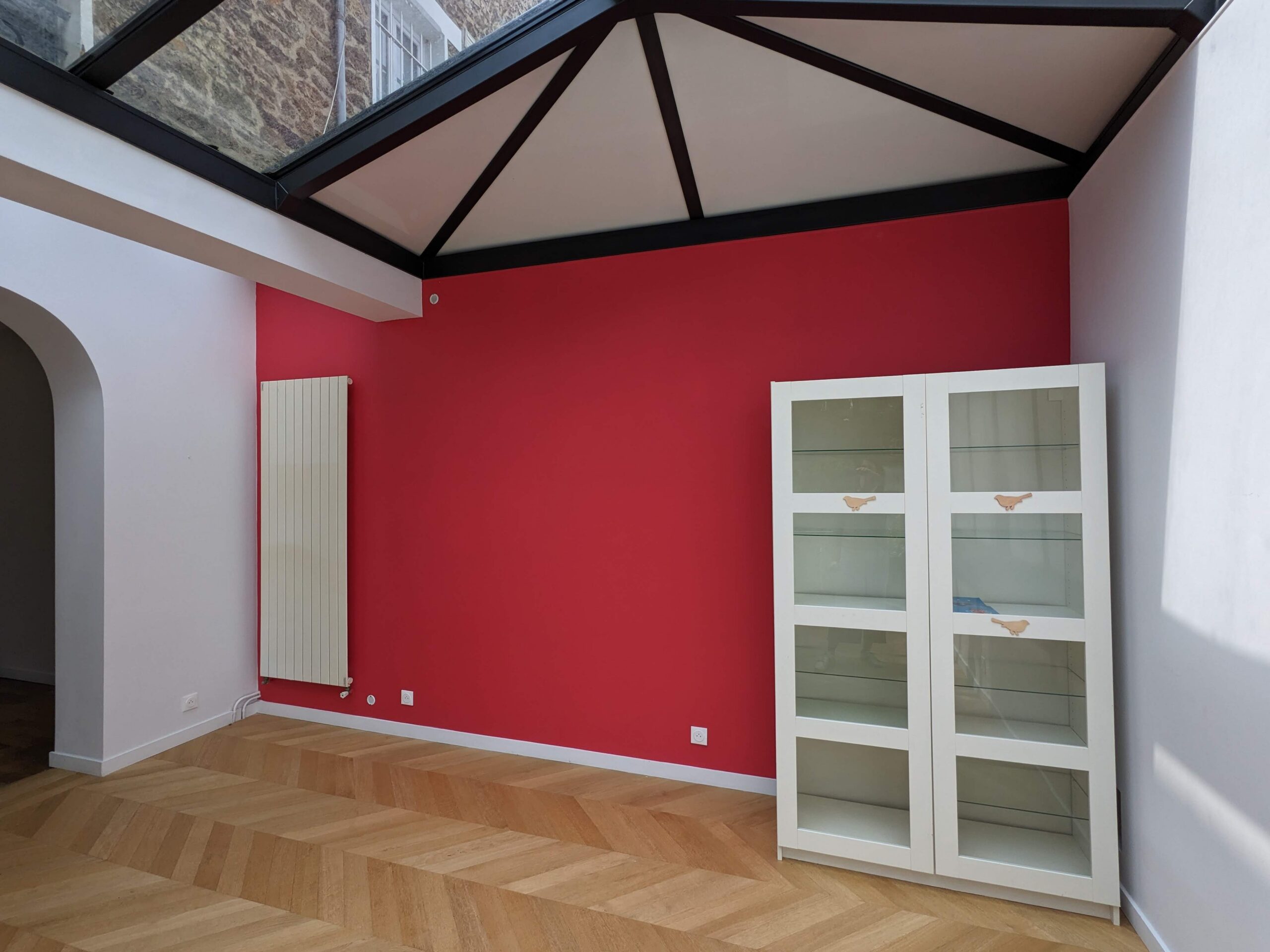 chambre nogent avantRenovation of a loft in Nogent-sur-Marne - Color-drenched bedroom with bespoke joineries