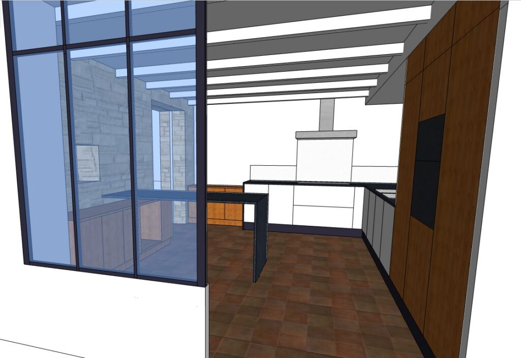 J’ai entièrement repensé l’agencement en m’éloignant des implantations classiques pour proposer une cuisine vivante, aux volumes travaillés. En jouant sur les hauteurs et les profondeurs des meubles, j’ai pu alléger la composition tout en répondant aux usages spécifiques du foyer. De même, les matériaux ont été choisis en cohérence avec le style de la maison, et donnent du rythme à l’ensembe : granit noir pour la robustesse et le contraste, chêne pour la chaleur, blanc mat pour la lumière et la sobriété.